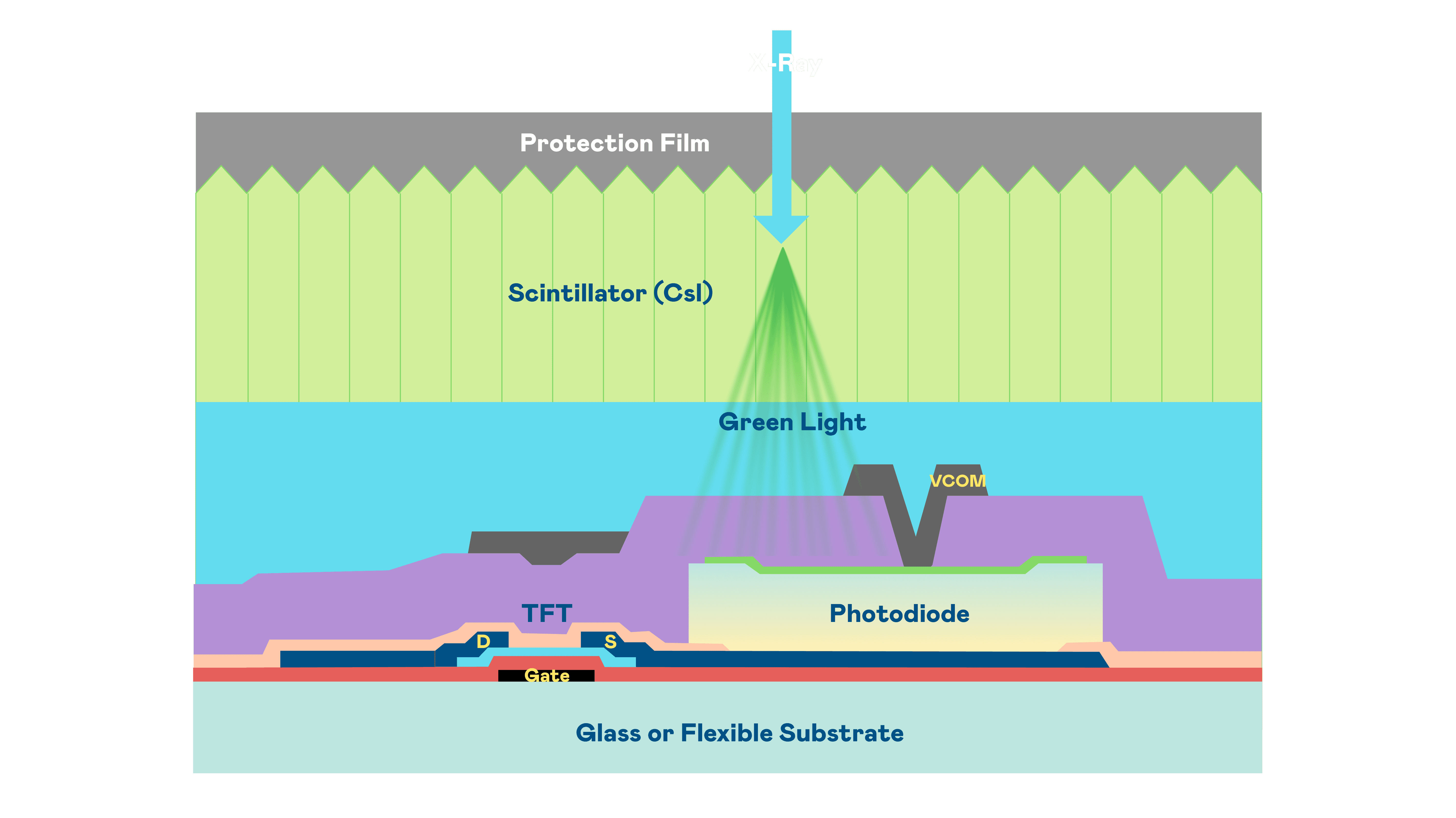 蓝狮在线的X光影像感测阵列使用薄膜电晶体 (TFT) 作为每个像素的读取开关,,搭配光电二极体(Photodiode)的光电转换元件,,,,用以感测X光影像讯号。。
